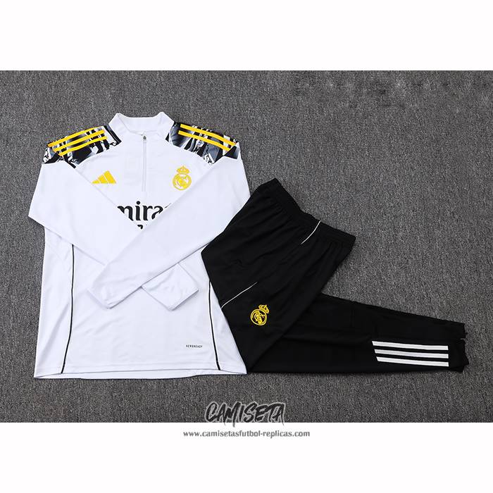 Chandal de Sudadera del Real Madrid 2025-2026 Nino Blanco esta confeccionada con un tejido transpirable que repele el sudor para mantenerte fresco, seco y cómodo dentro y fuera de la cancha. Una replicas camisetas futbol que puedes usar a diario, jugar al fútbol o disfrutar de los partidos con tus amigos sin problemas.