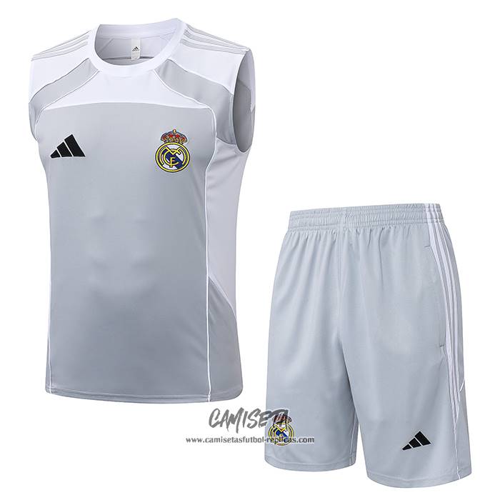Chandal del Real Madrid 2025-2026 Sin Mangas Blanco Gris esta confeccionada con un tejido transpirable que repele el sudor para mantenerte fresco, seco y cómodo dentro y fuera de la cancha. Una replicas camisetas futbol que puedes usar a diario, jugar al fútbol o disfrutar de los partidos con tus amigos sin problemas.